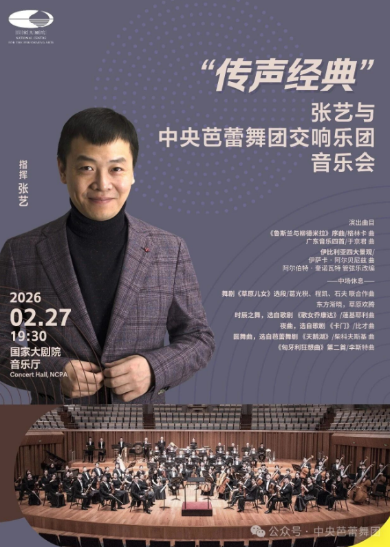 2026年2月27日,丙午马年新春佳节伊始,中央芭蕾舞团音乐总监、著名指挥家张艺将执棒中央芭蕾舞团交响乐团再度登台国家大剧院音乐厅,在元宵佳节即将到来前,以一场汇集中外音乐杰作的“传声经典”主题交响音乐会,向广大观众送上新春的祝福,开启马年全新的音乐旅程。