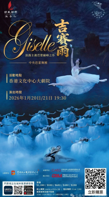 共赴芭蕾盛会,同迎福瑞新春。2026新年伊始,中央芭蕾舞团将应邀赴香港文化中心为“国风国韵飘香江”系列演出揭幕。此次演出我们将为香港的观众朋友们带来两部深受大家喜爱的作品:浪漫主义芭蕾巅峰之作《吉赛尔》与中国贺岁芭蕾舞剧《过年》。